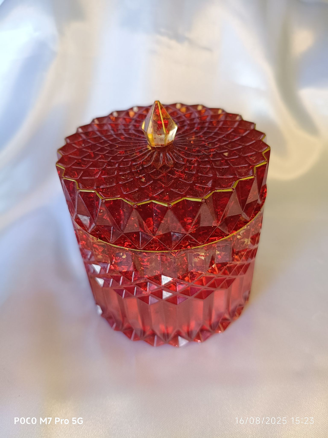 La boîte rouge est un véritable éclat de couleur. Un rouge profond et vibrant, recouvre la surface. Des liserés dorés, fins et élégants, serpentent le long de certains arêtes et des reliefs, ajoutant une touche de raffinement.