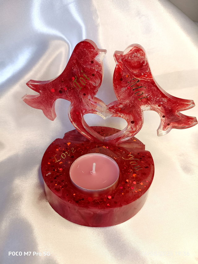 Ce photophore original met en scène un couple d'oiseaux rouge éclatant, parsemés de paillettes holographiques scintillantes. Sur chaque oiseau, les mots 'Toi' et 'Moi' se font écho, tandis que le socle proclame un vibrant 'I love you'. Une pièce unique pour célébrer l'amour et la complicité. Idéal comme cadeau de Saint-Valentin ou pour toute autre occasion de montrer votre amour.