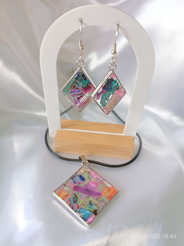 Laissez-vous envoûter par ce magnifique ensemble de bijoux aux reflets chatoyants. Le pendentif argenté, tel un écrin précieux, renferme un cœur de nacre aux couleurs vibrantes, suspendu à un cordon de cuir ajustable que j'ai remplacer par une chainette en acier inoxidable. Les boucles d'oreilles assorties, véritables joyaux de lumière, illumineront votre visage de leurs éclats irisés. Un ensemble unique, parfait pour sublimer votre style et affirmer votre personnalité.