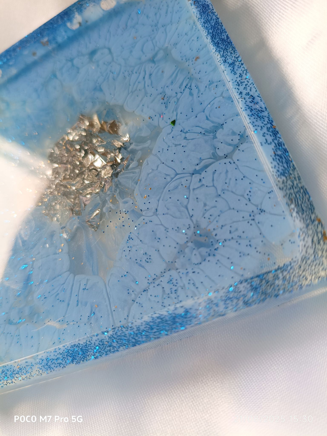 Voici un vide-poche carré original. Imaginez un petit plateau avec des contours bleu pailleté et un intérieur avec un effet nuageux bleu. C'est très poétique. Il est en résine époxy et idéal à poser dans une chambre ou une salle de bain.